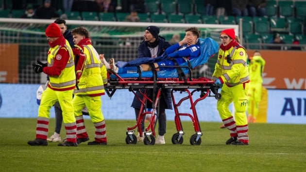 Schlimme Szene beim Match Rapid gegen den GAK am Sonntag: Gäste-Mittelfeldspieler Zeteny Jano musste in der ersten Halbzeit mit einer vermutlich schweren Verletzung abtransportiert werden.